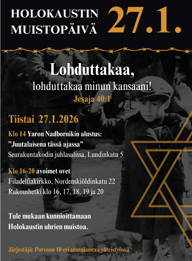 Holokaustin muistopäivää vietetään Porvoossa kahdessa tilaisuudessa tiistaina 27.1.2026: