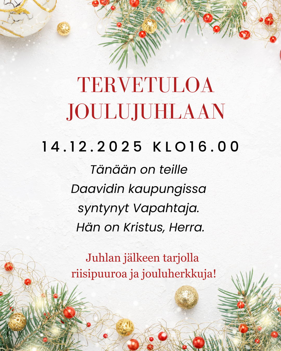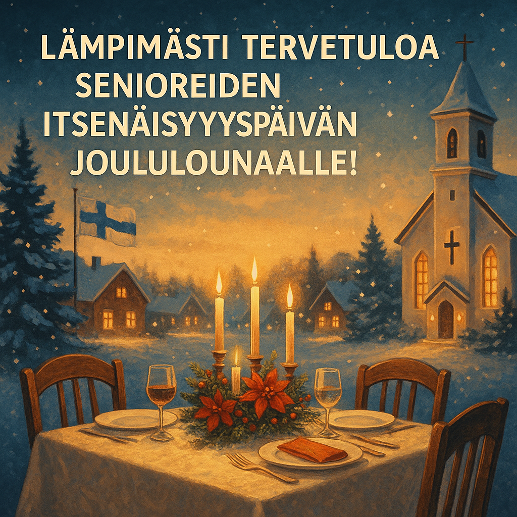 Senioreiden Itsenäisyyspäivän joululounas kokoaa yli 65-vuotiaat yhteiseen juhlahetkeen Porvoon Kotikirkolle pe 6.12. klo 14. Mukaan mahtuu rajattu määrä osallistujia, joten ilmoittautuminen 30.11. mennessä on välttämätöntä.